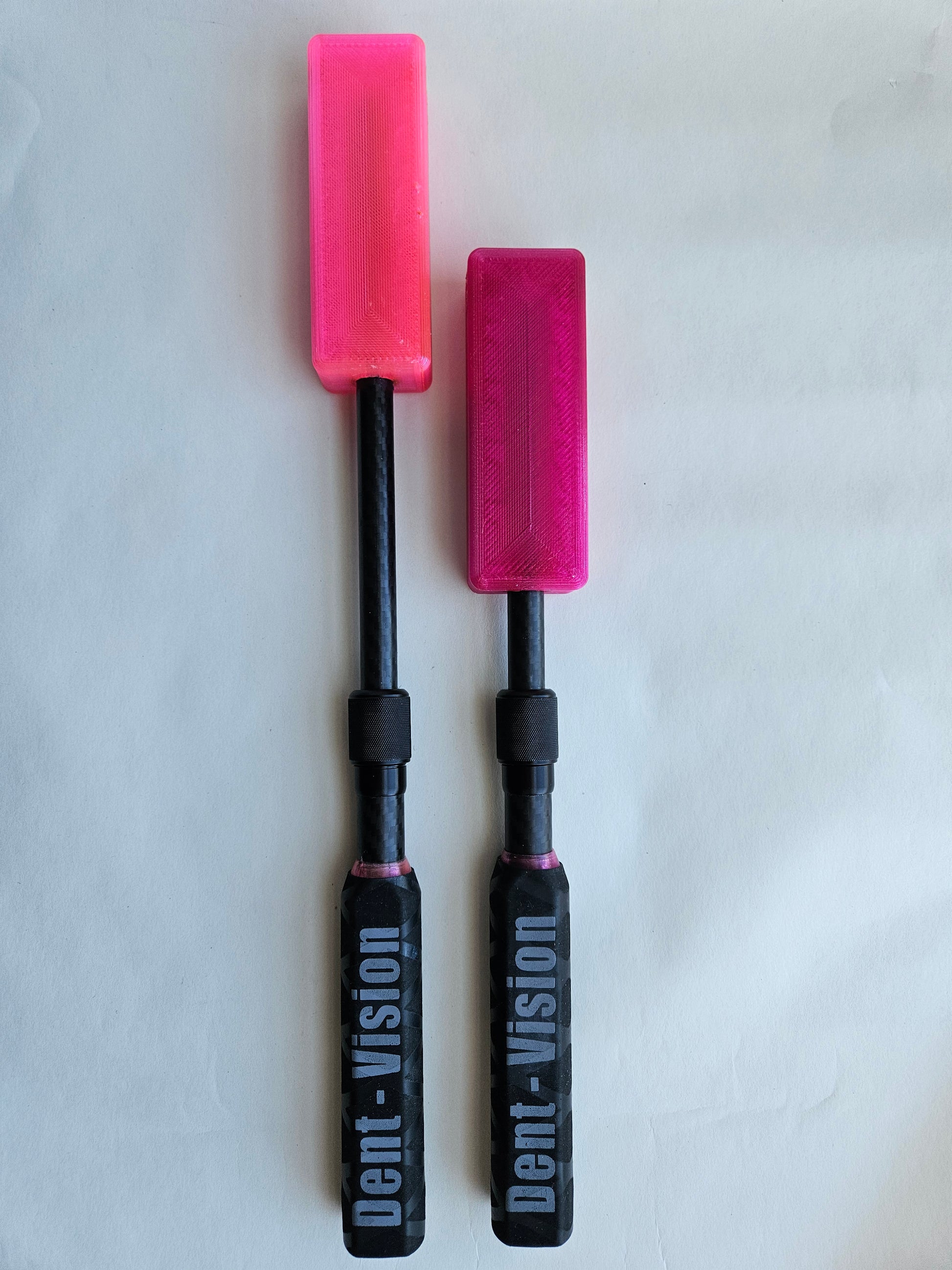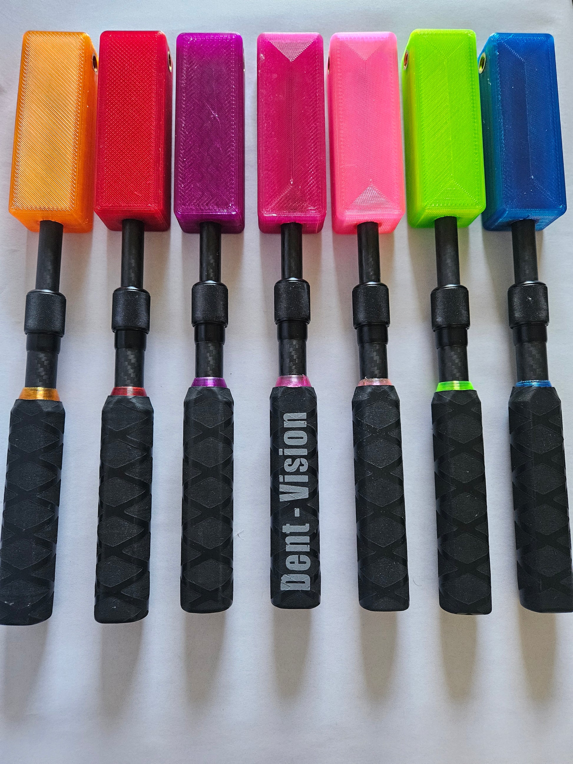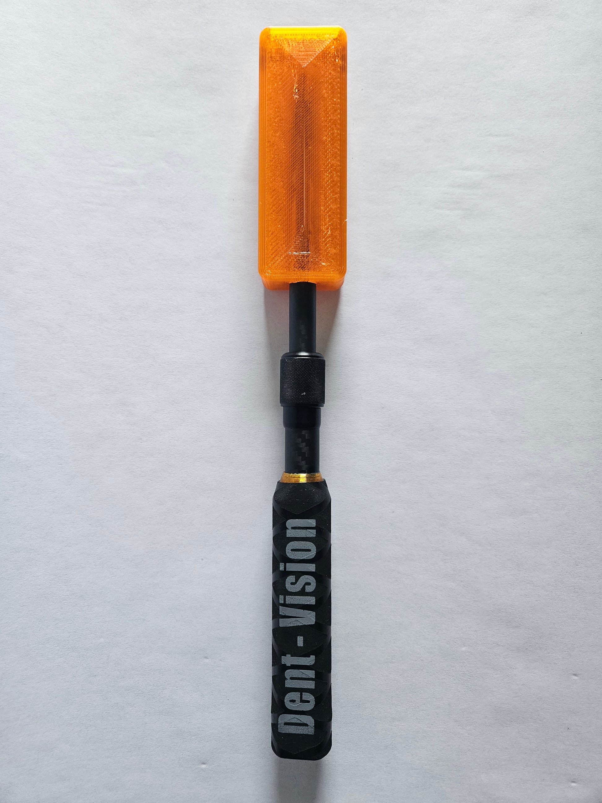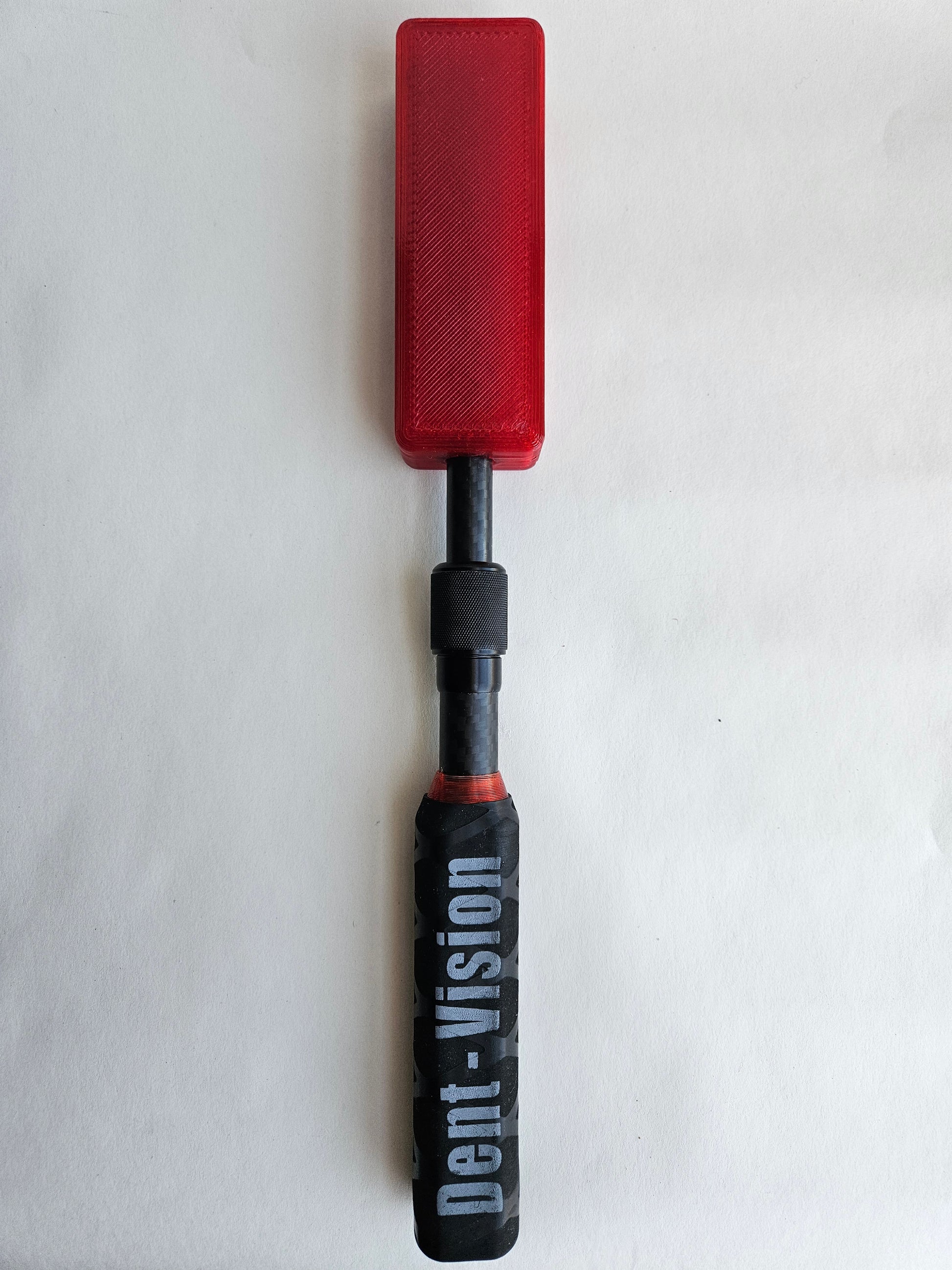 The Dent Zapper .Ext is a TPU paddle for a quiet yet effective smack and a carbon fiber shaft with a twist lock that allows you to extend the paddle from 12 inches to 17 inches. It also features two 5/16 - 18 threaded areas to add your interchangeable tips and use it like a hammer, also a 5/16 - 18 threaded area on the handle to add your comfort grip ball.